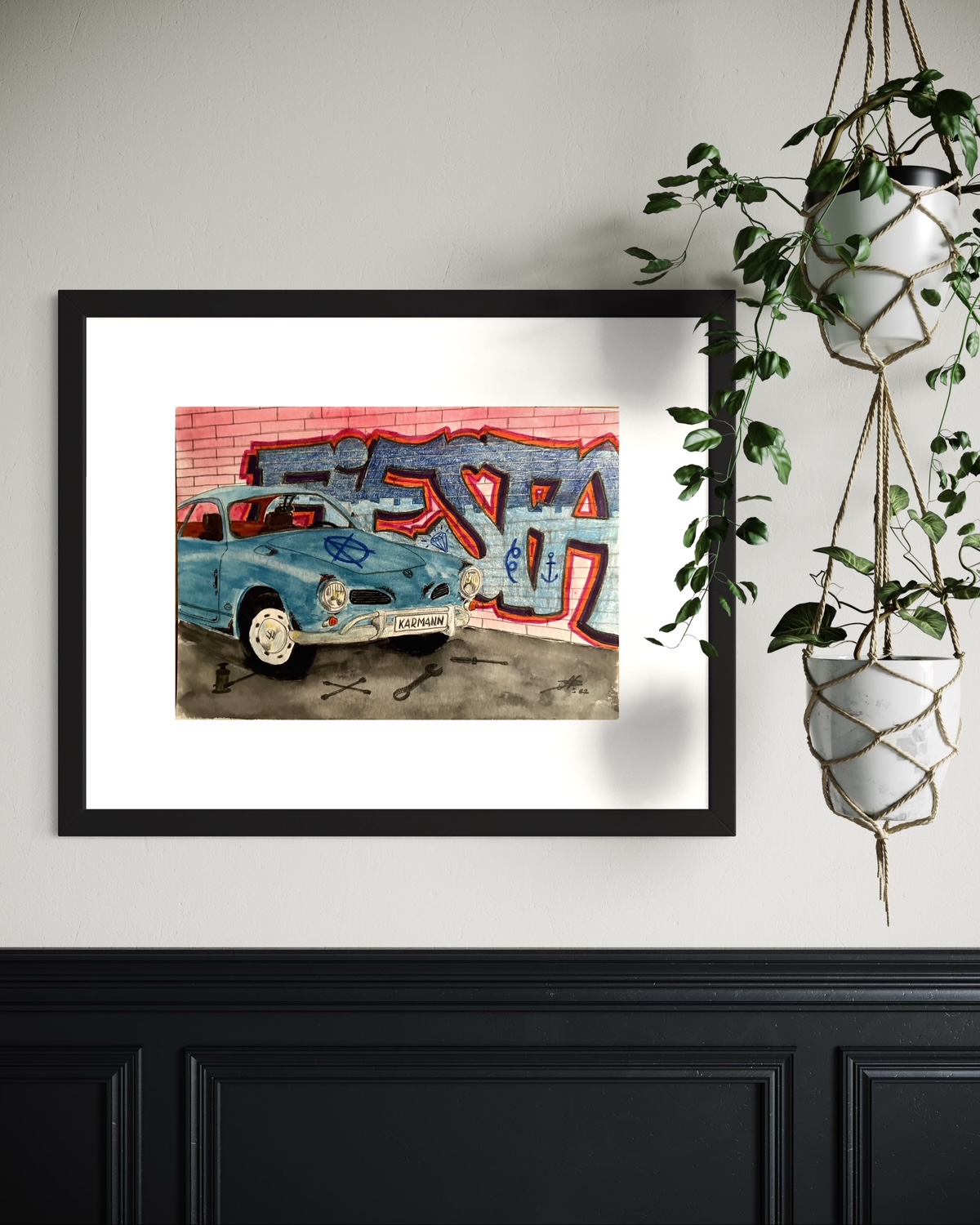Fakta om bilen: Volkswagen Karman Ghia är en bil som såldes mellan 1955 och 1974 av Volkswagen och fanns tillgänglig som 2+2 coupé eller cabriolet med kombinationen av chassi och mekanik av Type 1 (Beetle), styling av Lugi Segre från Italienska Carrozzeria Ghia och handbyggd kaross av den tyske karossbyggaren Karman. Bilen jag illustrerat är från året 1967 och har tagits av tidens tand, med en del rost och någon som gjort en anarki symbol på huven.