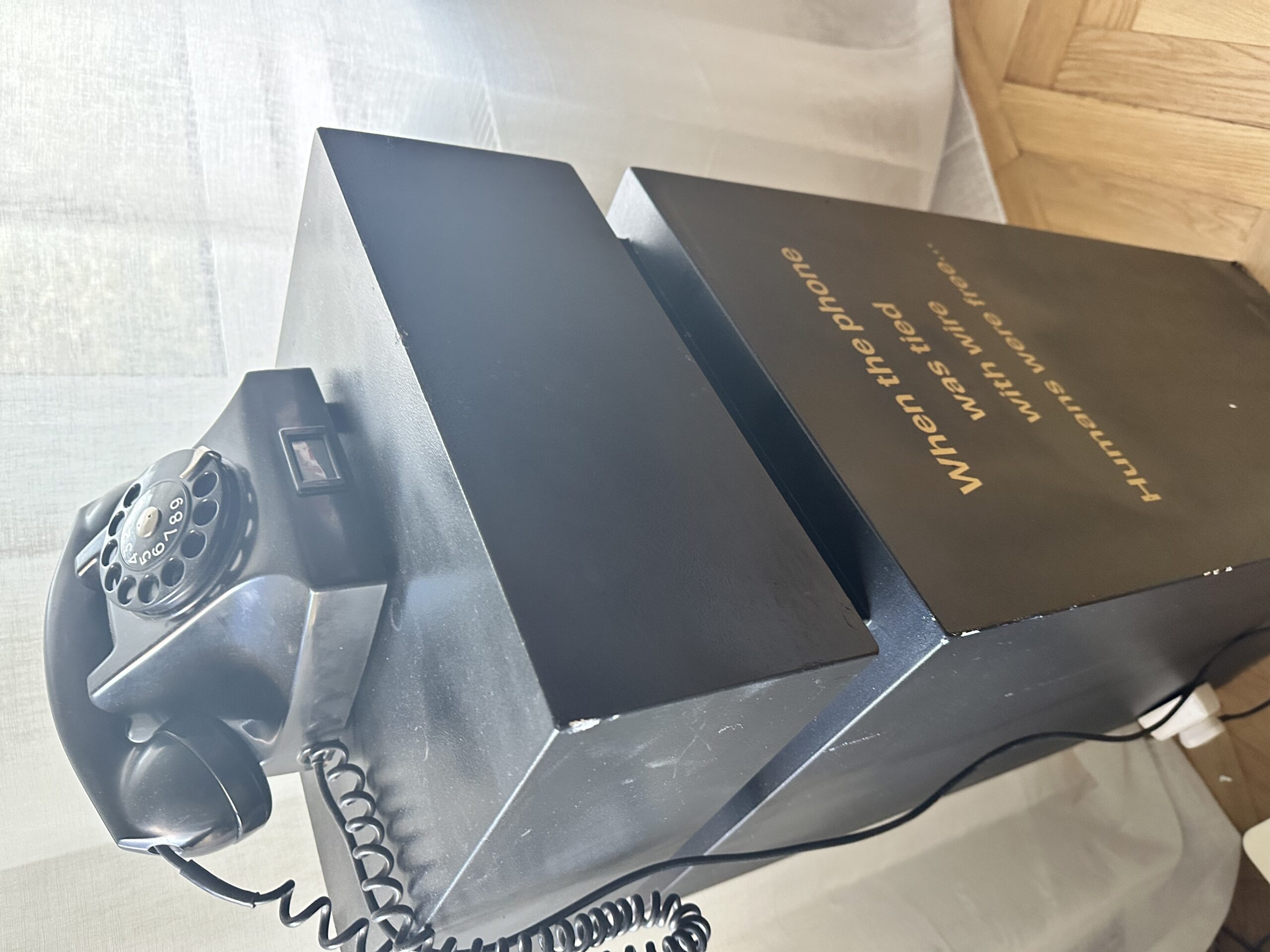 Skulptur, klassisk telefon på piedestal av svartmålat trä